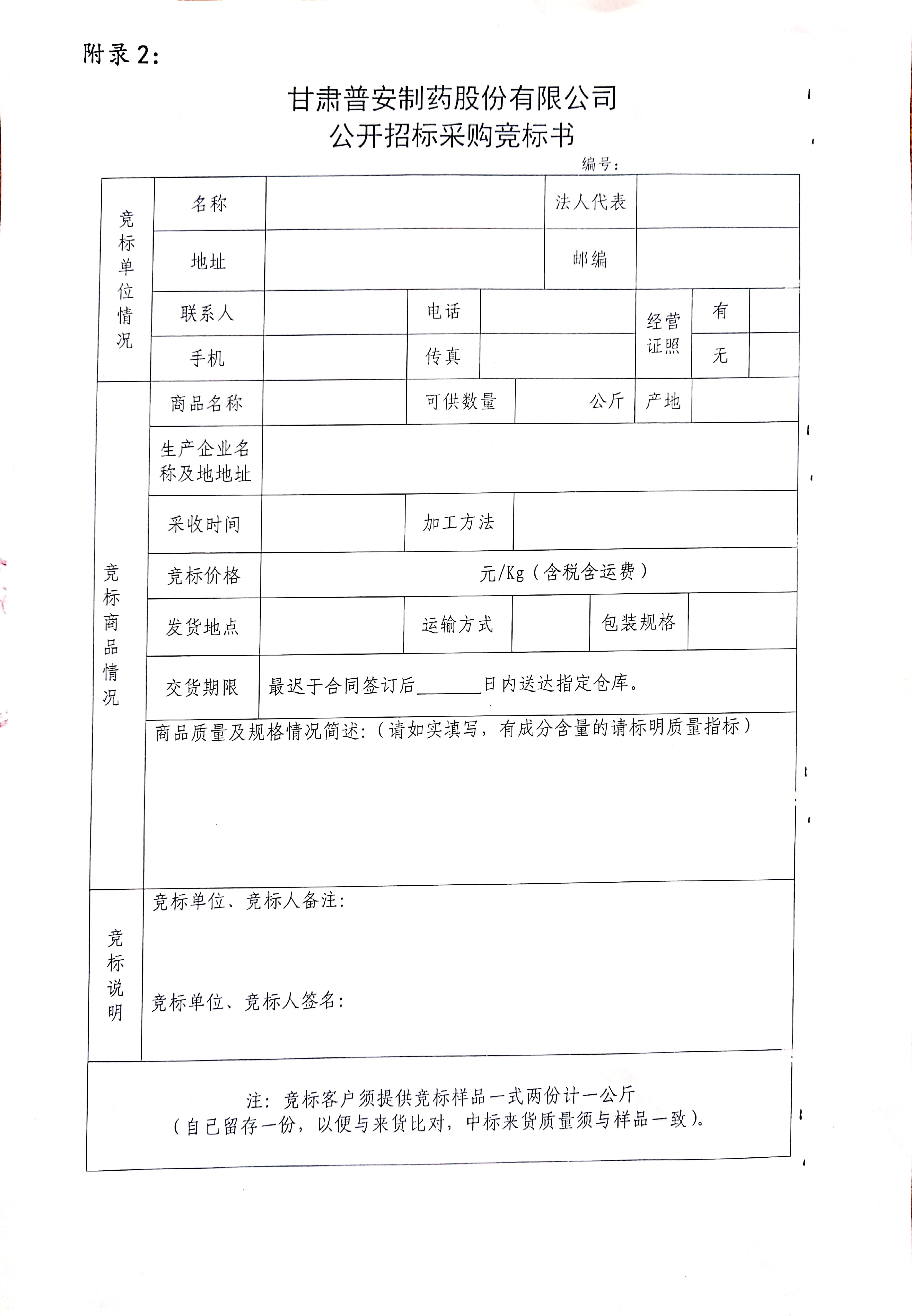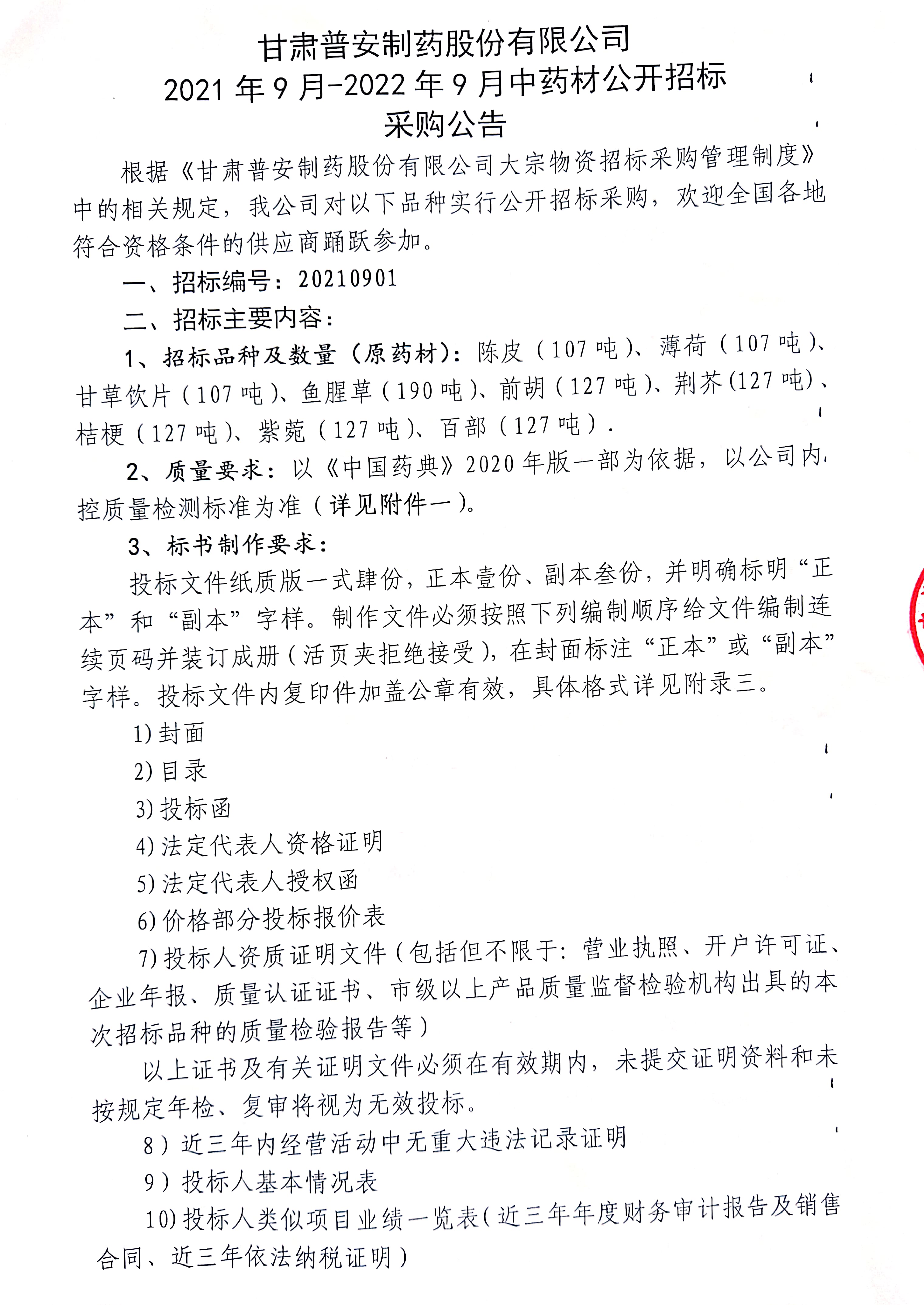 甘肅普安制藥股份有限公司 2021年9月-2022年9月中藥材公開招標采購公告
