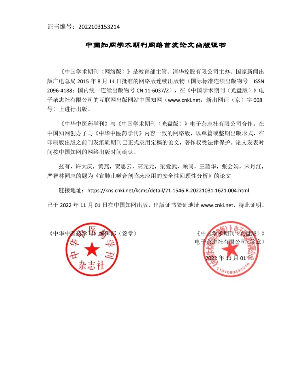宣肺止嗽合劑真實(shí)世界安全性再評價(jià)項(xiàng)目產(chǎn)出首篇論文通過網(wǎng)絡(luò)首發(fā)