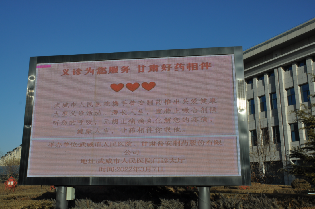 3月7日,普安制藥一行七人前往武威市人民醫(yī)院開展“慶三·八,關愛婦女”慰問活動,并聯合武威市人民醫(yī)院開展“相約三月 關愛健康”義診活動,為全市人民送醫(yī)送藥送健康。向奮戰(zhàn)在抗“疫”一線及醫(yī)院各科室女醫(yī)護人員致以節(jié)日的問候和誠摯的祝福!并借助此次活動向醫(yī)務工作者及廣大市民宣傳、推介了宣肺止嗽合劑及元胡止痛滴丸。