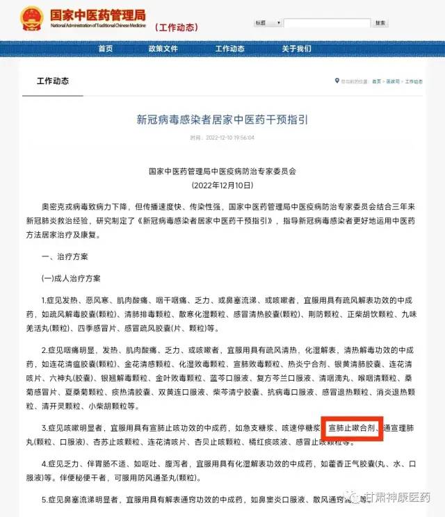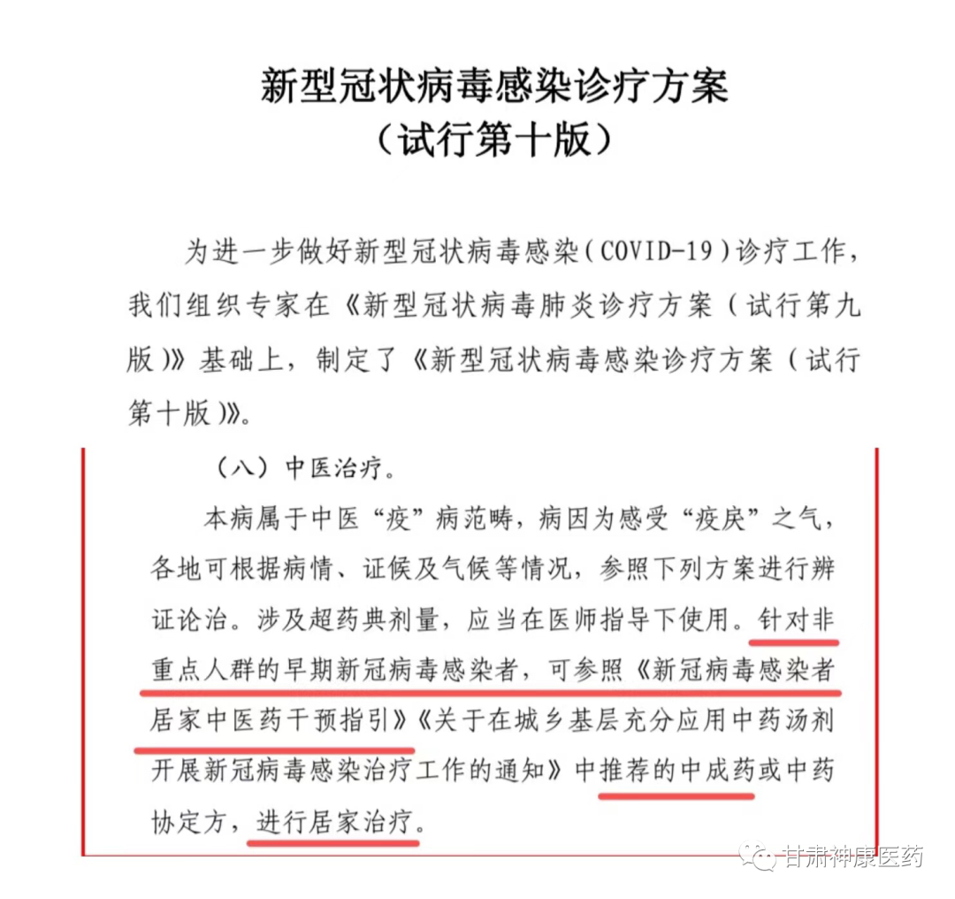 1月5日國家衛(wèi)生健康委辦公廳、國家中醫(yī)藥局綜合司發(fā)布的《新型冠狀病毒感染診療方案(試行第十版)》,在中醫(yī)治療部分,明確提出針對非重點人群的早期新冠病毒感染者,可參照《新冠病毒感染者居家中醫(yī)藥干預指引》《關于在城鄉(xiāng)基層充分應用中藥湯劑開展新冠病毒感染治療工作的通知》中推薦的中成藥或中藥協(xié)定方,進行居家治療。