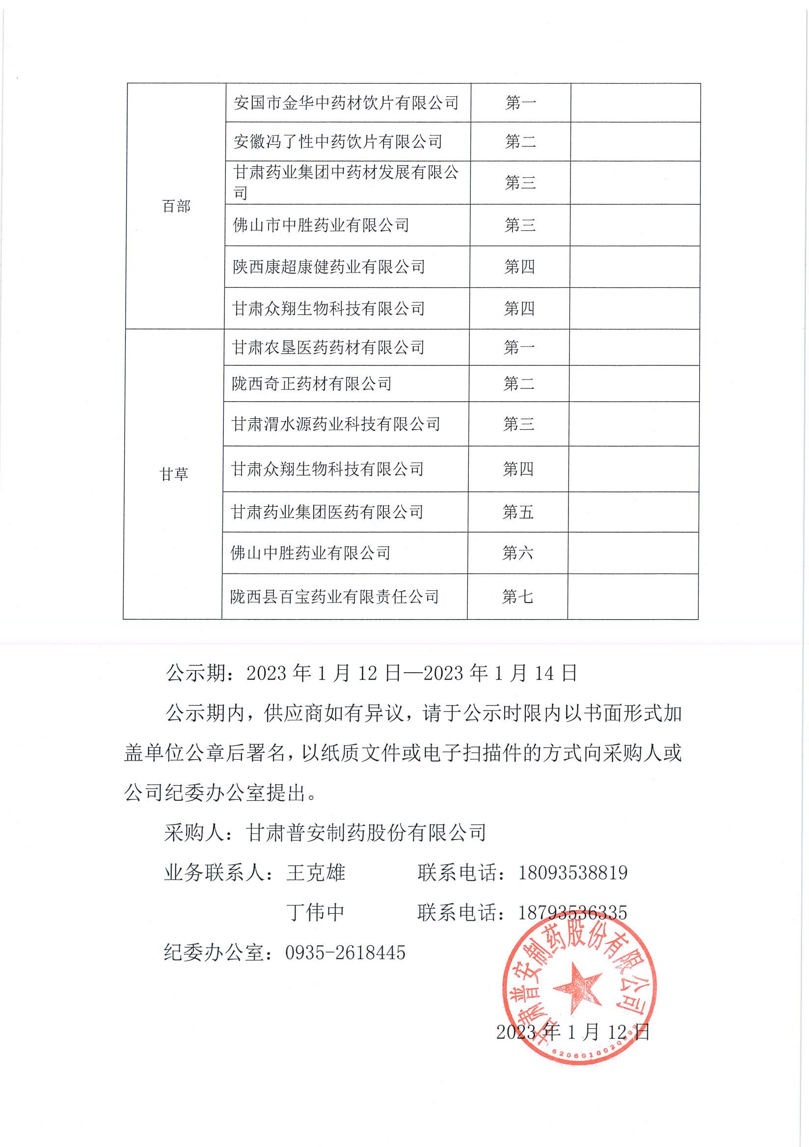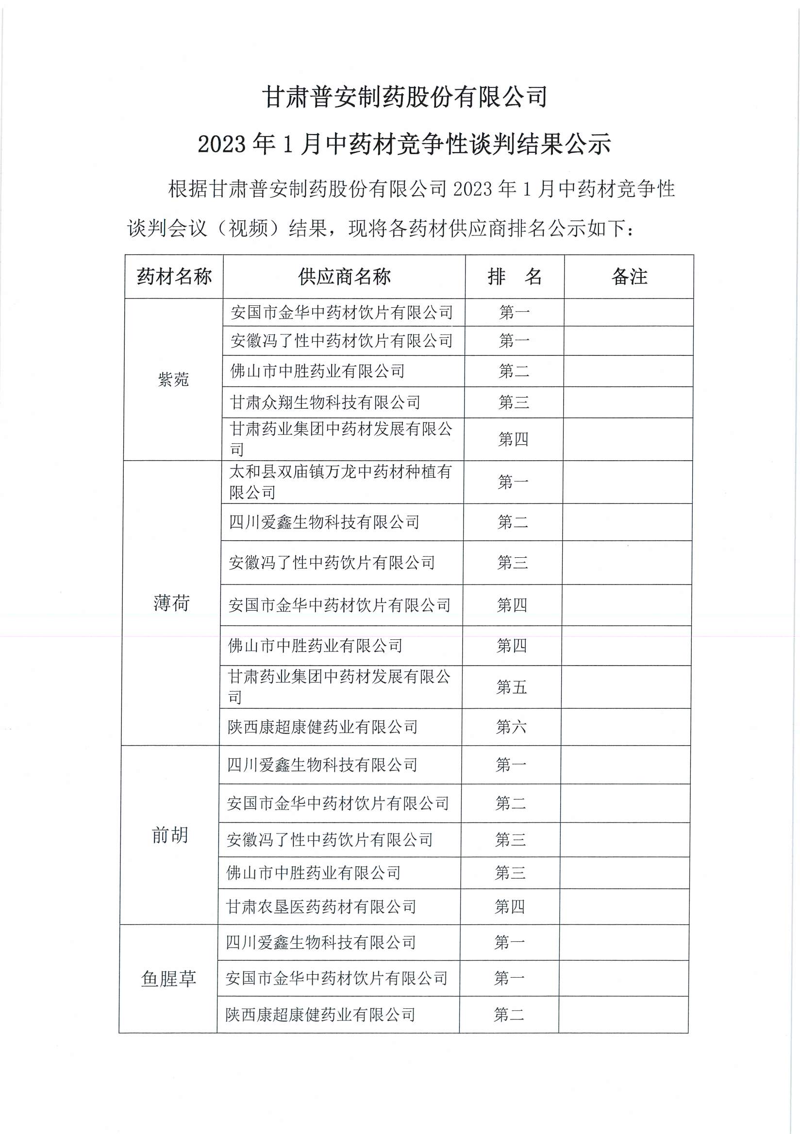 甘肅普安制藥股份有限公司2023年1月中藥材競爭性談判結(jié)果公示