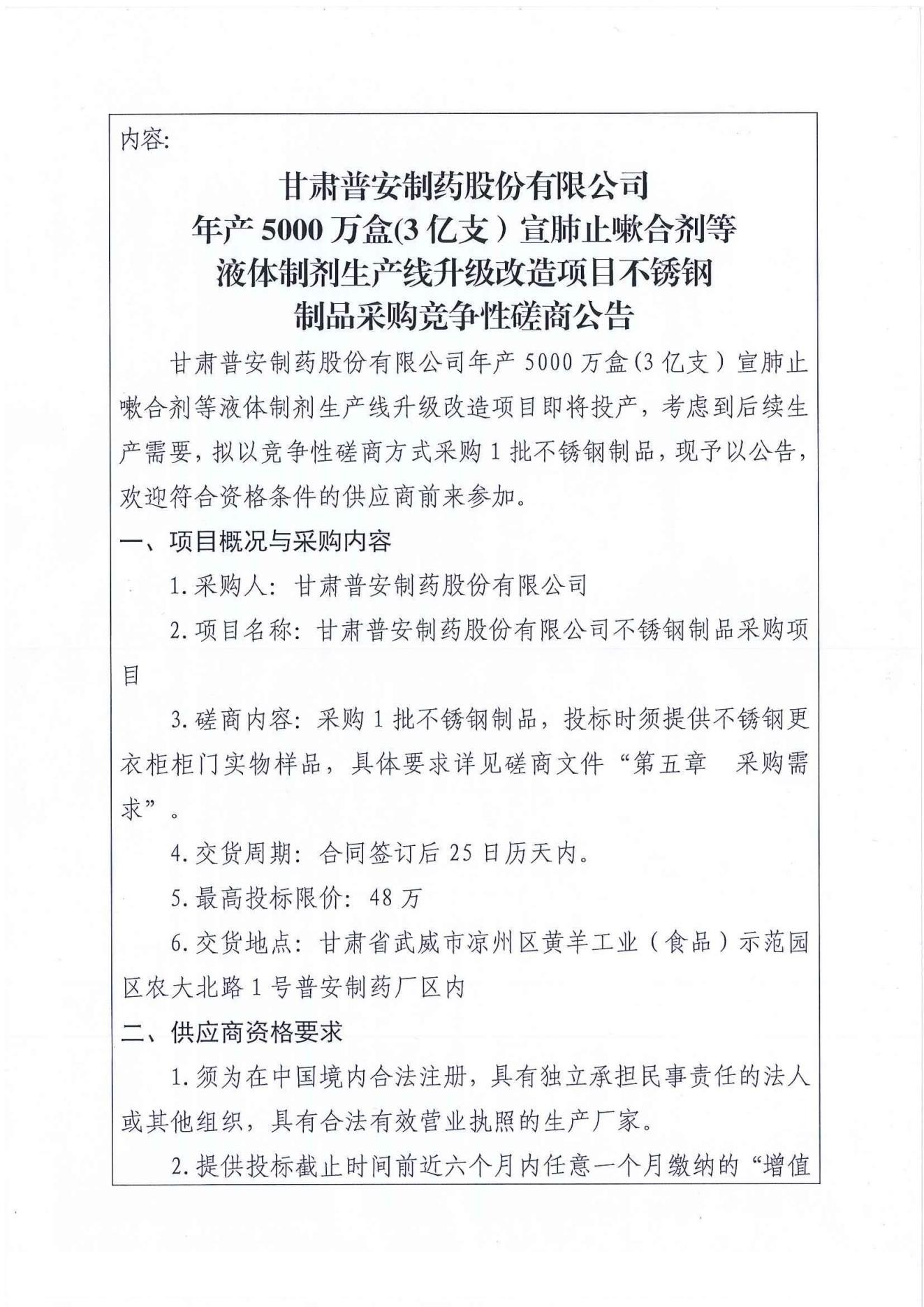 甘肅普安制藥股份有限公司年產(chǎn)5000萬盒(3億支)宣肺止嗽合劑等液體制劑生產(chǎn)線升級改造項目不銹鋼制品采購競爭性磋商公告