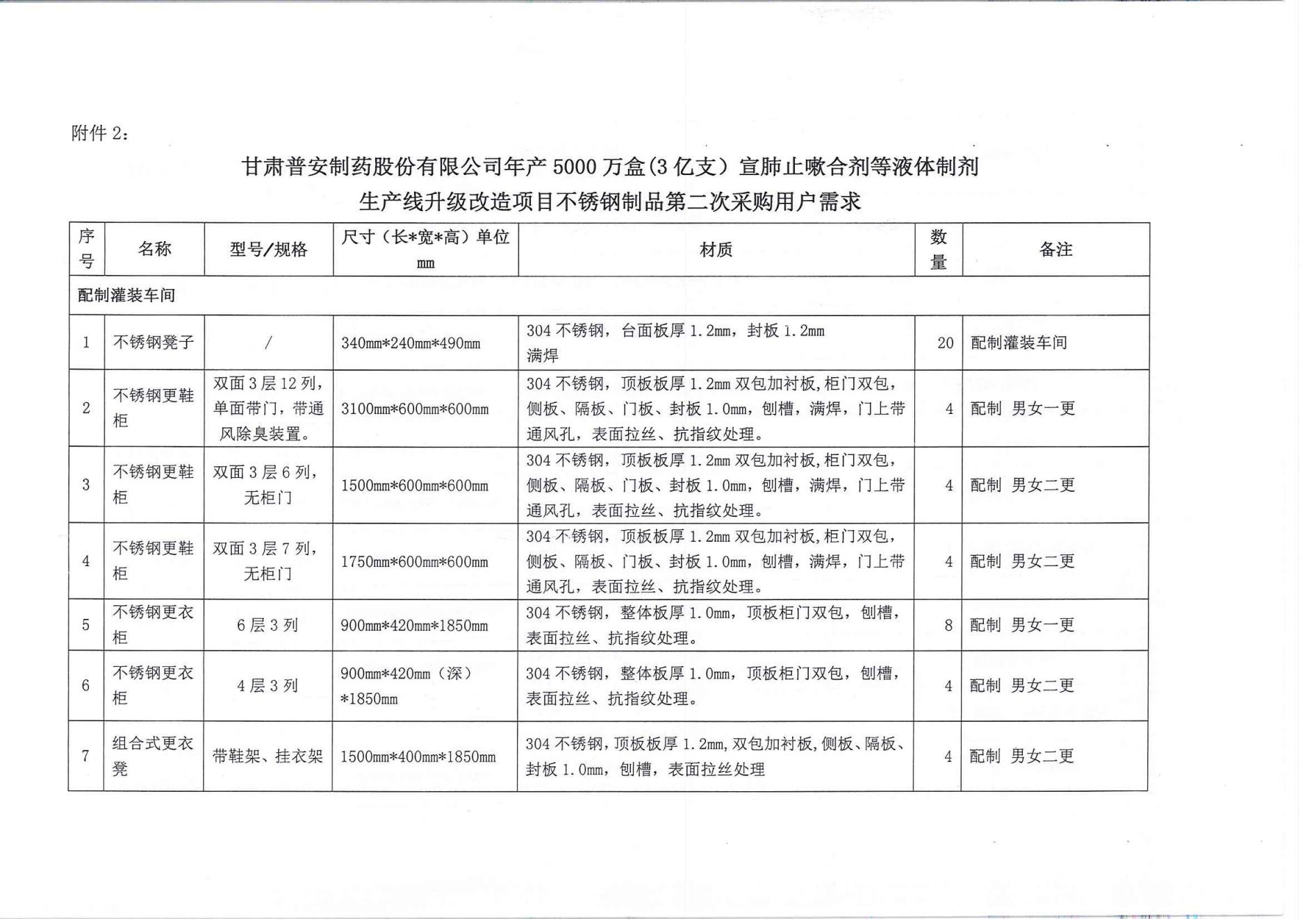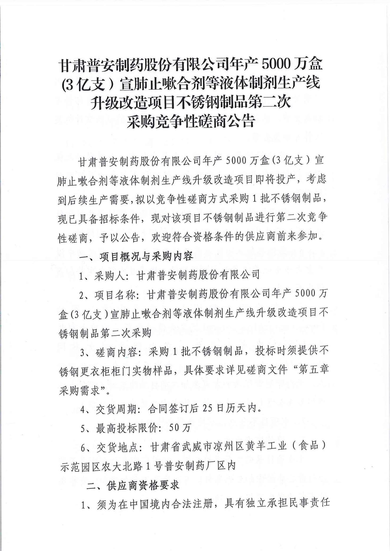 甘肅普安制藥股份有限公司年產(chǎn)5000萬盒(3億支)宣肺止嗽合劑等液體制劑生產(chǎn)線升級改造項(xiàng)目不銹鋼制品第二次采購競爭性磋商公告