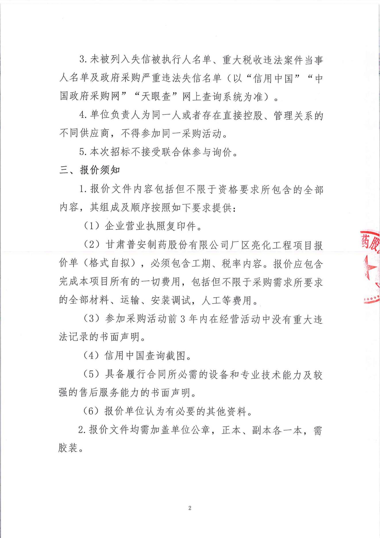甘肅普安制藥股份有限公司廠區亮化工程項目詢價公告