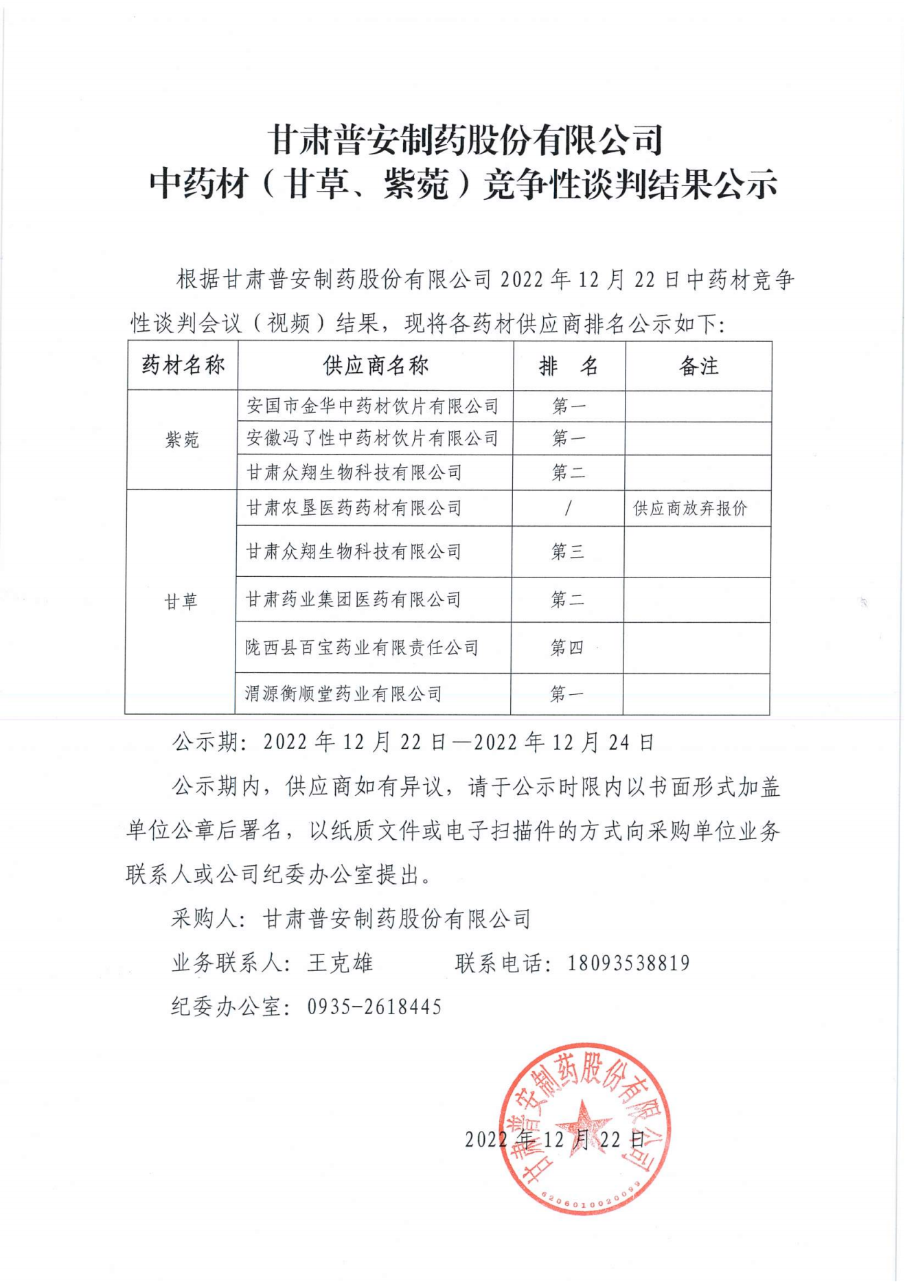 甘肅普安制藥股份有限公司 中藥材(甘草、紫菀)競(jìng)爭(zhēng)性談判結(jié)果公示