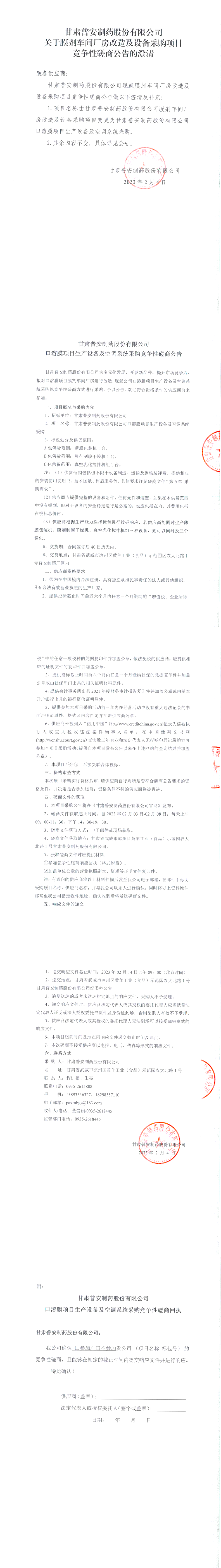 甘肅普安制藥股份有限公司關(guān)于膜劑車(chē)間廠房改造及設(shè)備采購(gòu)項(xiàng)目競(jìng)爭(zhēng)性磋商公告的澄清