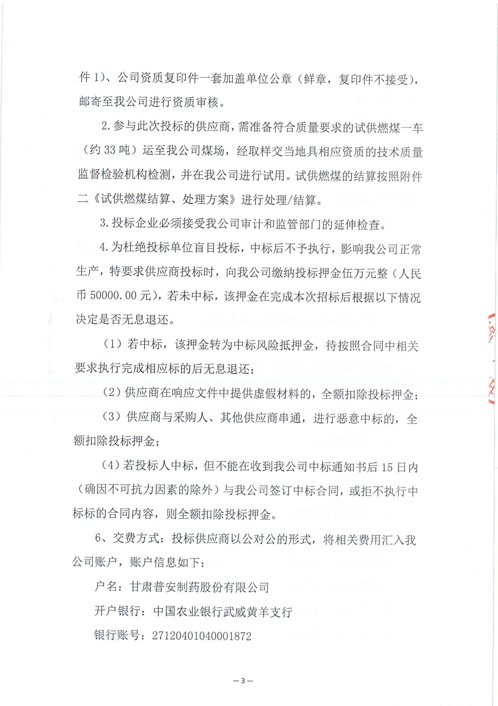 甘肅普安制藥股份有限公司2023年4月燃煤采購競爭性磋商公告