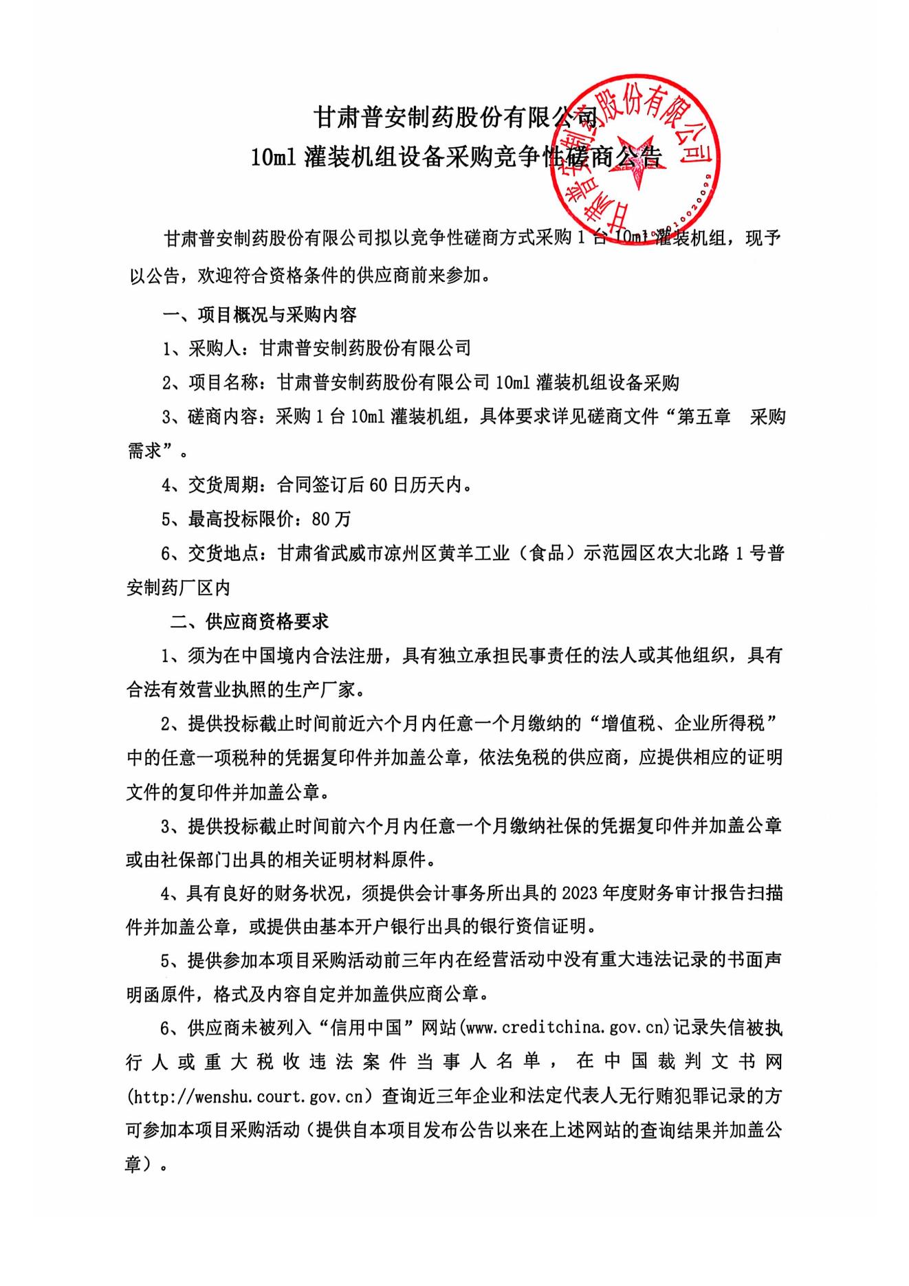 甘肅普安制藥股份有限公司10ml灌裝機組設備采購競爭性磋商公告