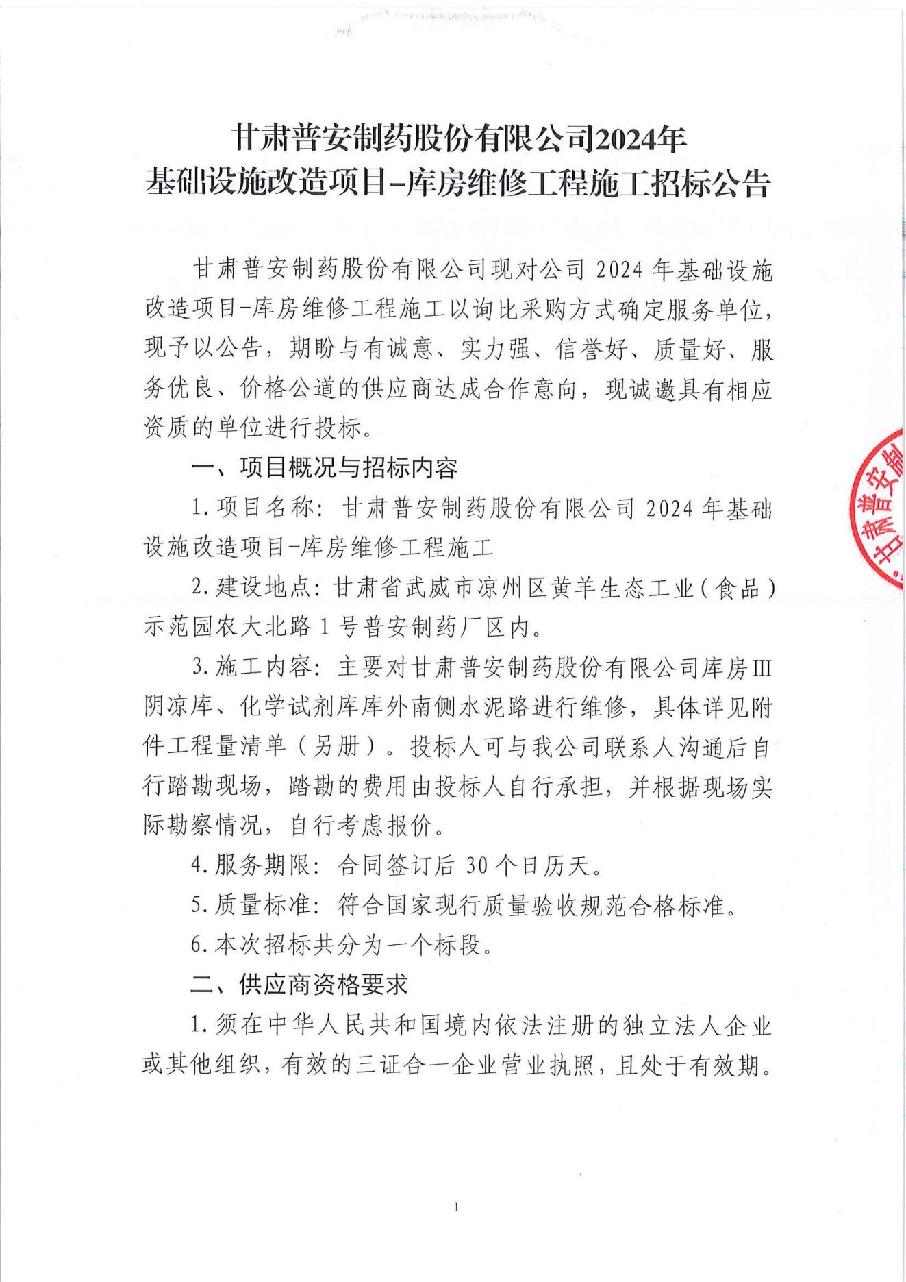甘肅普安制藥股份有限公司2024年基礎設施改造項目-庫房維修工程施工招標公告