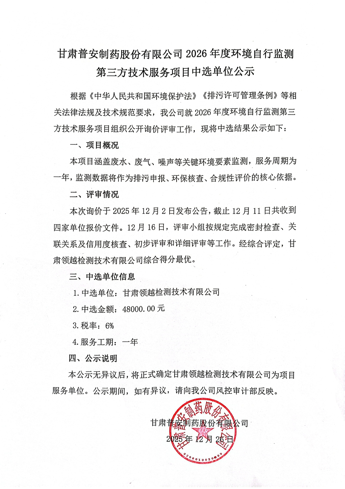 甘肅普安制藥股份有限公司2026年度環(huán)境自行監(jiān)測(cè)第三方技術(shù)服務(wù)項(xiàng)目中選單位公示