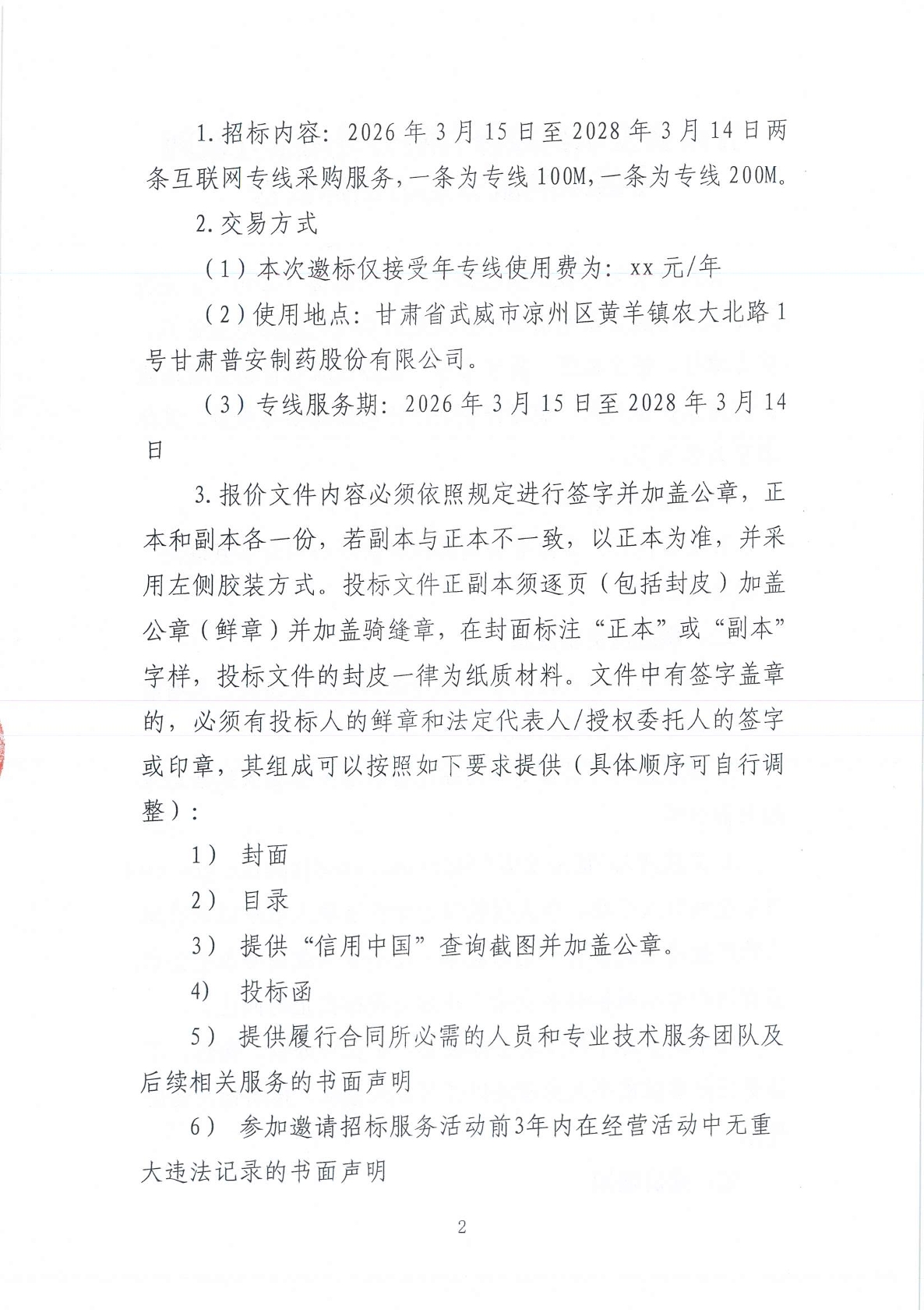 甘肅普安制藥股份有限公司兩條互聯網專線采購服務邀請招標公告